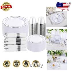Confidently serve hot dishes like pasta and turkey with these sturdy plates. ELEGANT DESIGN: Featuring classic white plates with timeless silver rims, this disposable dinnerware set mimics the elegance of authentic ceramic plates. Create a sophisticated ambiance that will leave a lasting impression on your guests. PERFECT DIMENSIONS: This remarkable dinnerware set comes with everything you need for your event: 50 dinner plates (10.25 inches), 50 salad plates (7.5 inches), 50 sets of pre-rolled napkins with silverware, and 50 cups (9 oz). CONVENIENT TO USE: Say goodbye to complicated party prep!
