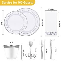 But it is also made with high-quality materials that ensure durability and long-lasting use. This elegant plastic dinnerware set will add a touch of sophistication to any table setting! Perfect for creating a memorable dining experience for your guests. EVERYTHING INCLUDED - 700 piece silver plastic dinnerware set with 100 10.25" dinner plates, 100 7.5" salad plates, 100 Paper Napkins, 100 9oz cups, 100 knives, 100 forks, and 100 spoons.