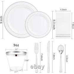700PCS Silver Plastic Plates - Silver Plate Set 100Guest - Disposable Dinnerware Sets 100Silver Rim Dinner Plates 100Silver Dessert Plate 100Paper Napkins&Cups&silver Plastic Silverware Set. UNIQUE DESIGN-These silver plastic plates have a classic round shape and are decorated with a circle of silveren lines. These white and silver plates are very sophisticated and elegant.