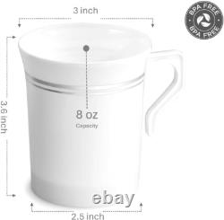 OCCASIONS 120 Mugs Pack, gobelets jetables en plastique de 8 oz pour mariage, fête, café/thé/cappuccino/espresso avec poignées (gobelets de 8 oz, blanc avec bord argenté). Poids de l'article : 8 onces.